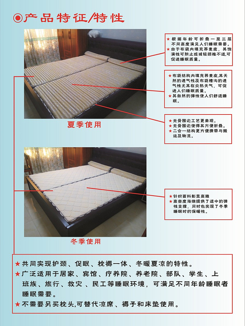 荞麦皮功能床垫(便携式睡垫),是席梦思弹簧床垫、褥子、凉席和枕头的替代品,是基于荞麦皮为睡垫芯的轻量化技术解决方案。由于传统的床垫即大又笨,且又大量消耗钢丝等有色金属材料,基于这样的背景杜慧峰发明了本项目。