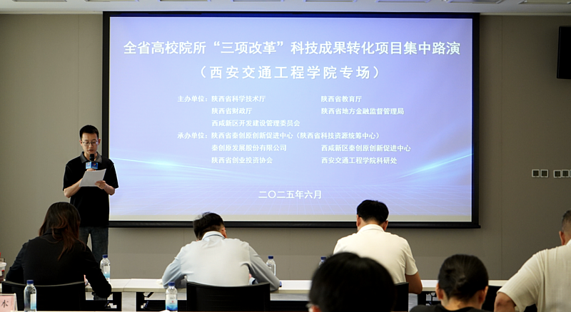2025年6月26日下午14:00,全省高校院所“三项改革”科技成果转化项目集中路演(西安交通工程学院专场)在西咸国际会议中心举办。本次活动由陕西省科学技术厅,陕西省教育厅,陕西省财政厅,陕西省地方金融监督管理局,西咸新区开发建设管理委员会主办,在陕西省秦创原创新促进中心(陕西省科技资源统筹中心),秦创原发展股份有限公司,西咸新区秦创原创新促进中心,陕西省创业投资协会,西安交通工程学院的协办下成功举行。西安交通工程学院科研处、陕西省秦创原创新促进中心(陕西省科技资源统筹中心)、秦创原(咸阳)创新促进中心、瑞垚投资、煊佑资本、惟道资本、启迪之星、皓玺资本和金融服务机构负责人以及学校路演教师代表参加现场路演活动,该活动在线上平台同步展示。